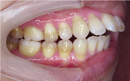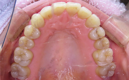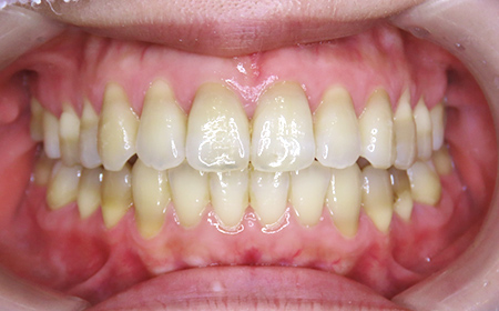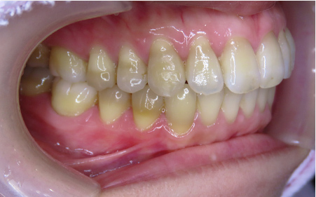 「前歯でかみにくい」でご相談にいらっしゃいました。マウスピース装着および「ゴムかけ」が必要でしたが、装着時間を守られ、歯が予定通り動いていきました。痛みもなく、歯が引っ込み、とても喜んでおられました。